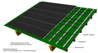 Gegenüber bestehenden Systemlösungen von Photovoltaik Unterkonstruktionen mit Klemmung der PV-Module wurde hier ein neues Montagekonzept mit Einhangsicherungen erfolgreich erprobt, dass die PV-Module unmittelbar lagefixiert, diese dennoch verschieblich bleiben und sich so Vorteile beim Einbau in steile Dächer ergeben, dadurch das zusätzliche Maßnahmen zur Abrutschsicherung entfallen.